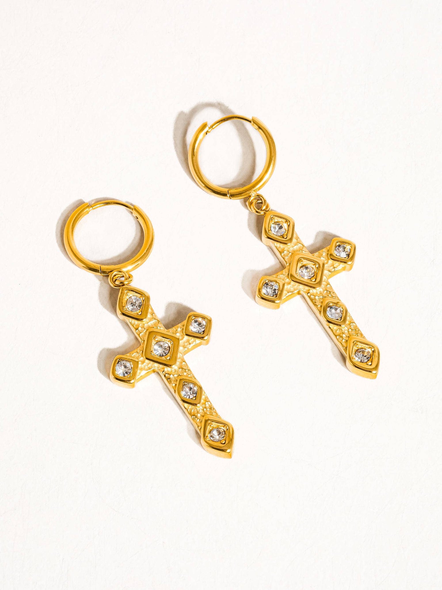 Materials & Measurements: 18K Non-Tarnish CZ Cross Earring 18K Gold Plating Stainless Steel Rhinestone Measurement (L x W inch): 1.25inx0.40in -l